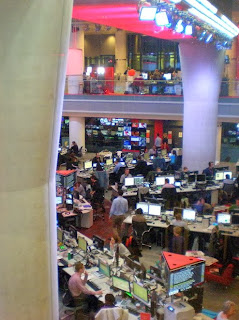 There were hordes of people around reception, plus paparazzi outside waiting for Katy Perry (about whom I know only the name and what she does). Then I was whisked down a corridor overlooking the largest newsroom in Europe - impressive and Metropolis-y - towards the studio where Tim Willcox was sitting behind a familiar desk.