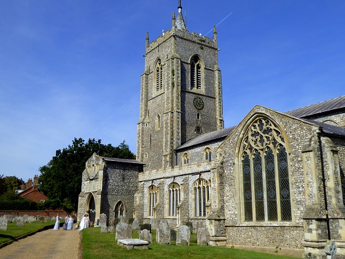 St Andrew, Buxton, is most striking for the massive yews that flank it as you approach from the road. They glinted in the setting sun when we reached it on our walk, but perhaps look even better on our Sunday morning visit to catch the church open (it was, but a service meant we drove on to Lammas and back again).