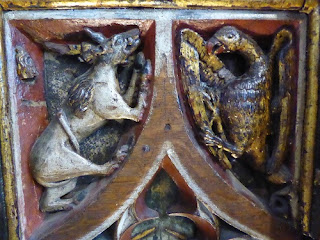 It's less remarkable for the remarkable for the 16 painted figures than for the carvings in the spandrels, including a faceless St George fighting the dragon.