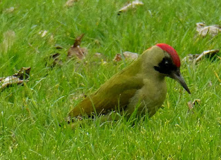 What's a bit hard at the moment is that the winter visitors out back, the goldfinches, and in Margravine Cemetery, the redwings, don't seem to have returned. I felt a spring in my step after seeing one of the two bitterns regularly to be sighted at the London Wetland Centre. But I'm waiting for major colour like this, from two Green Woodpeckers, which greeted us on our 6 March visit.