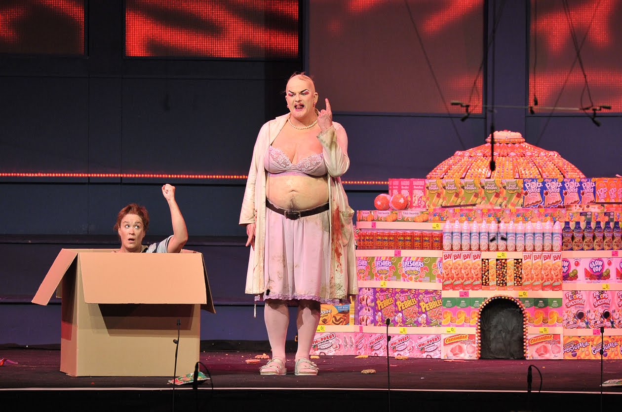 Needless to say Wolfgang Ablinger-Sperrhacke's bald, hairy-bellied fright of a Witch (pictured above with the definitive Hansel of Alice Coote by Chris Christodoulou for the Proms) set some chins wagging, and one old bloke accosted us at the end to tell us he'd walked out in disgust. But children can take it. And of course we all oohed and aahed at the semi-staging's solution to the vast supermarket-sweep 'house' of the original production: a mini Albert Hall. But of course! Yet who'd have thought it - and I wonder what Sir Henry would have made of Rosina Leckermaul sticking her pink wig on his bust. Had a good laugh like the rest of us, I hope.